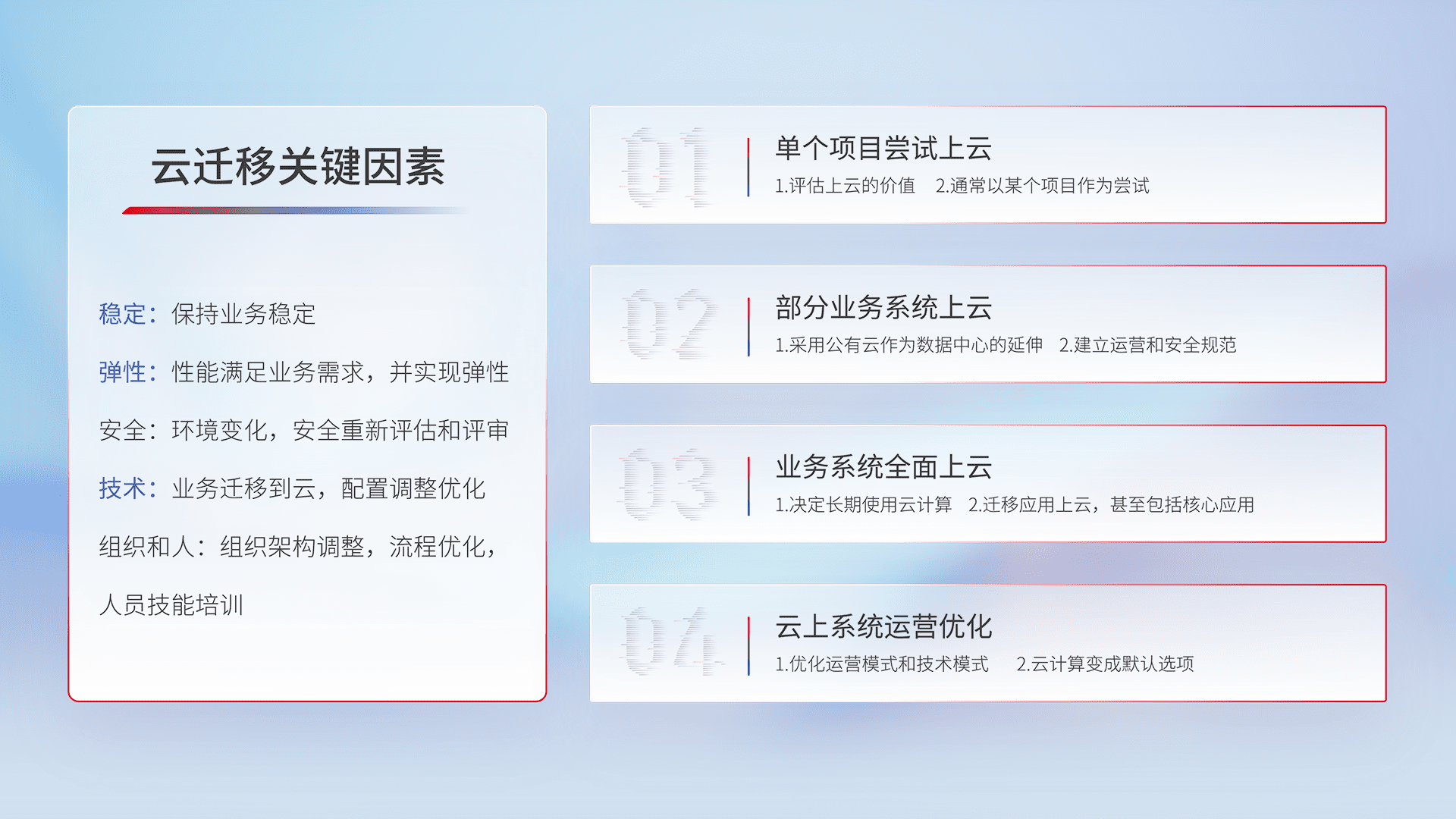结合实际业务,,,从规划设计、、、云平台选型、、、云原生改造、、、、数据迁移、、、、集成交付,,,迁移全过程为客户识别最佳上云路径,,,,做好风险识别管理,,,设计网络架构、、、身份权限、、、安全审计合规、、、、操作审计、、、日志审计、、监控告警策略、、、、多站点容灾设计等,,,对云上基础设施进行整体规划,,,,提升IT治理水平,,以满足弹性、、高可用、、、高性能的需求。。